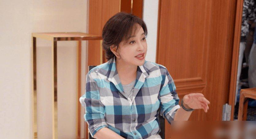 刘晓庆穿浅蓝色格子衫挺清新,可配个低马尾算怎么回事?