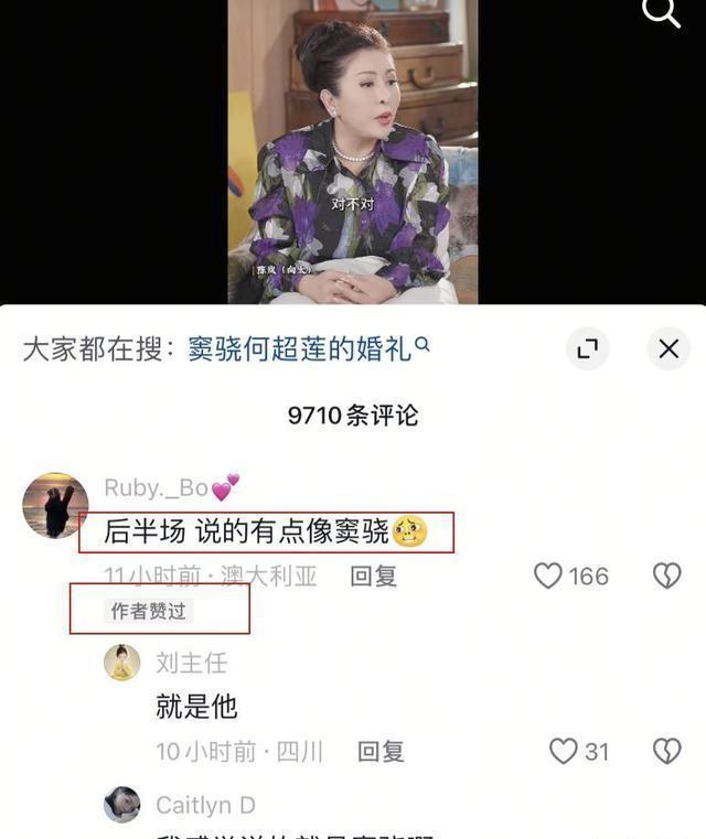 评论区十分热闹,纷纷在留言富家女的故事讲的是窦骁跟何超莲,两人传闻正在闹离婚,向太则是在直接点赞了网友评论的“窦骁何超莲,就差报名字了”,向太不止点赞了一个窦骁的评论,还有一条评论“后半场,说的有点像窦骁”,向太直接点赞了,点赞一次可能说是手滑,点赞两次直接点明了。